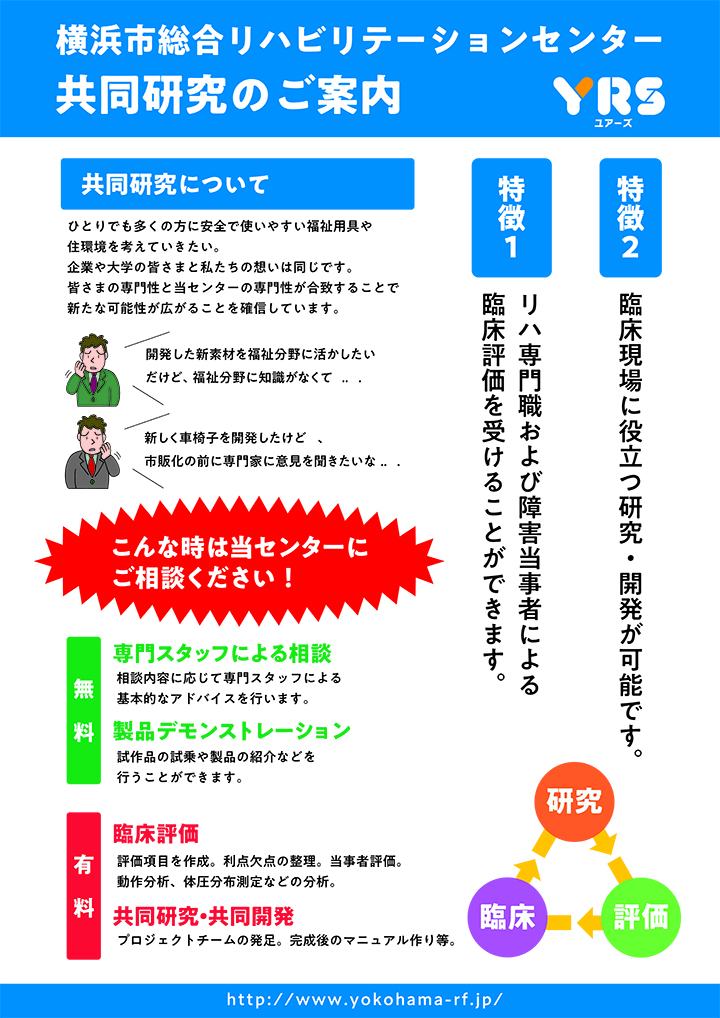 横浜市リハビリテーションセンターの研究開発部門は、高齢者や障害者の生活支援のため、福祉機器や住環境の研究を企業・大学と共同で行っています。豊富な臨床経験と機械、電気、建築、義肢装具の専門性を持ち、製品の臨床評価やヒアリング調査が可能です。