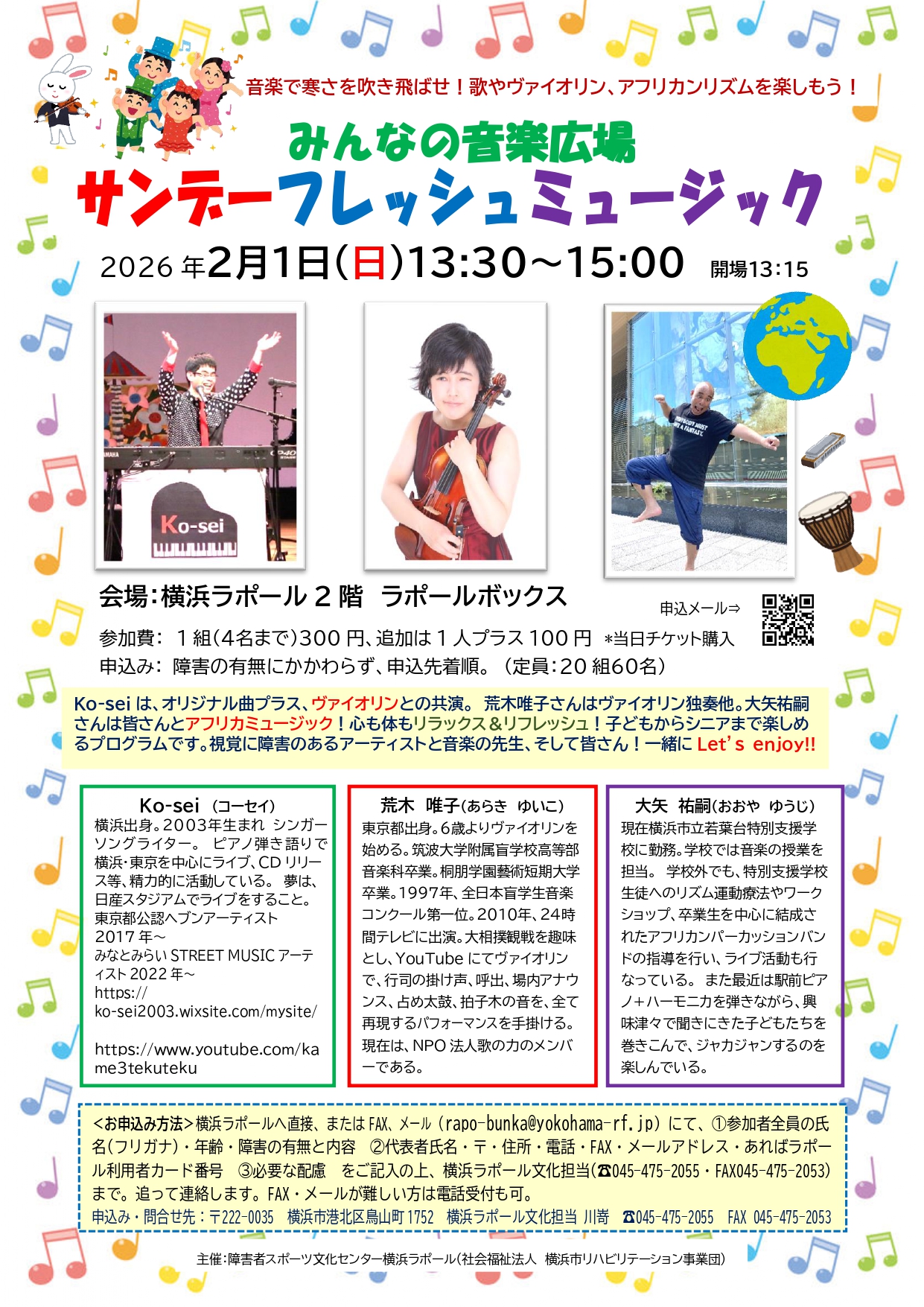 申込方法:横浜ラポールへ直接、またはFAX、メール(rapo-bunka@yokohama-rf.jp)にて、①参加者全員の氏名(フリガナ)・年齢・障害の有無と内容 ②代表者氏名・〒・住所・電話・FAX・メールアドレス・あればラポール利用者カード番号 ③必要な配慮 をご記入の上、横浜ラポール文化担当(☎045-475-2055・FAX045-475-2053)まで。追って連絡します。FAX・メールが難しい方は電話受付も可。