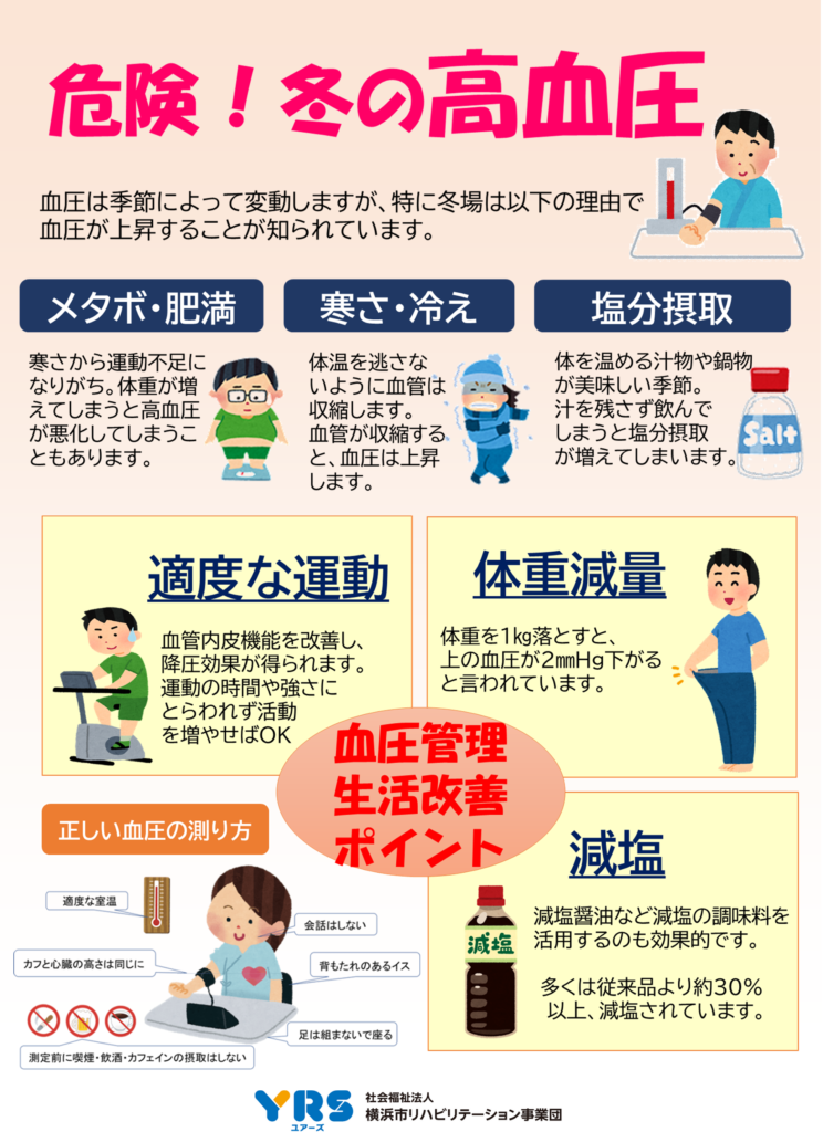 今月のポスターでは冬の高血圧の注意点や、押さえるべきポイントを紹介しています。体重、運動、食事の管理をして、寒い冬を健康な体で乗り越えましょう!