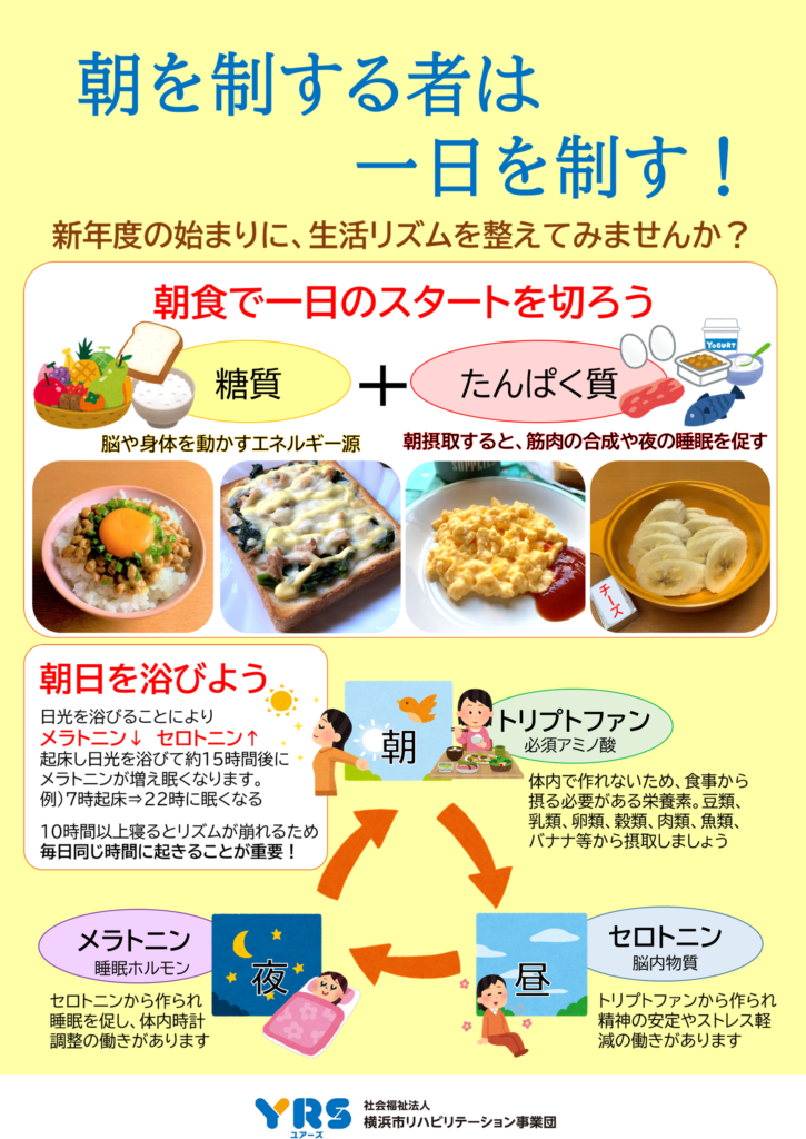 今月のポスターでは、生活リズムを整えるコツや、朝食選びのポイントを紹介しています。朝食を食べている人はさらにレベルアップさせたり、食べていない人は食べられそうなものから始めてみたり、これを機に取り組んでみませんか?