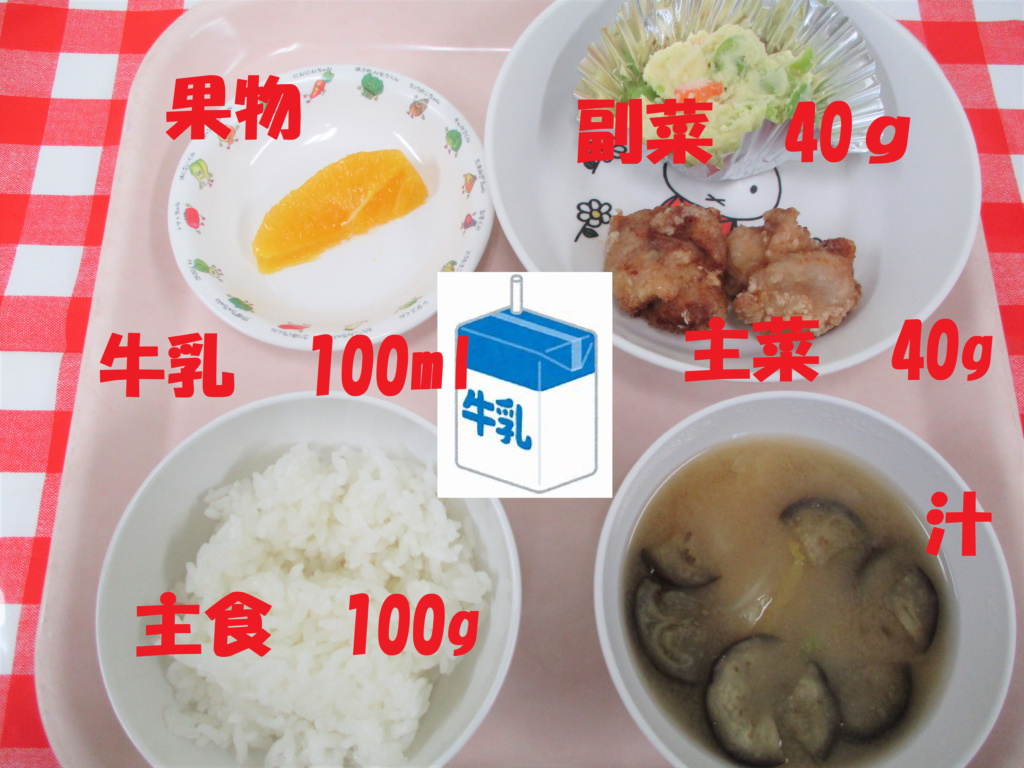日本人の食事摂取基準をもとに、各施設での基準量を算定しています。給食のエネルギー量は約450kcal程度です。おおよその食事量は、ごはん100g、主菜40g、副菜40g、牛乳100ml、汁物、果物です。