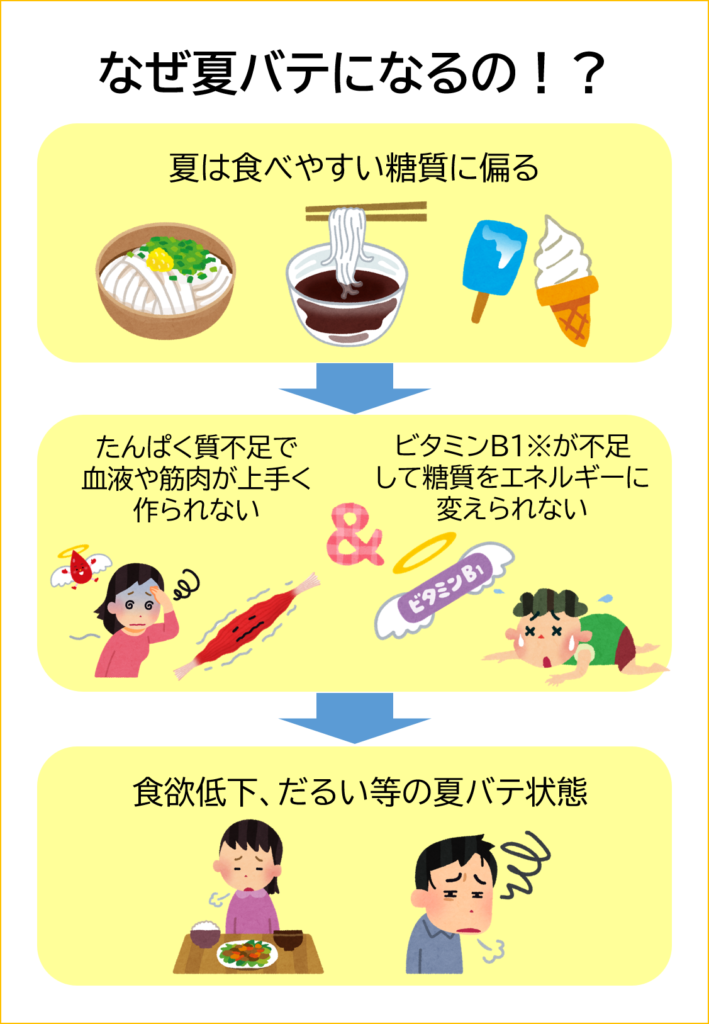 ※ビタミンB1…糖質をエネルギーに変える働きのあるビタミン。糖質を多く摂取した時はその分ビタミンB1の摂取も増やさないと、うまくエネルギーを作り出すことが出来なくなり、疲れの原因になります。