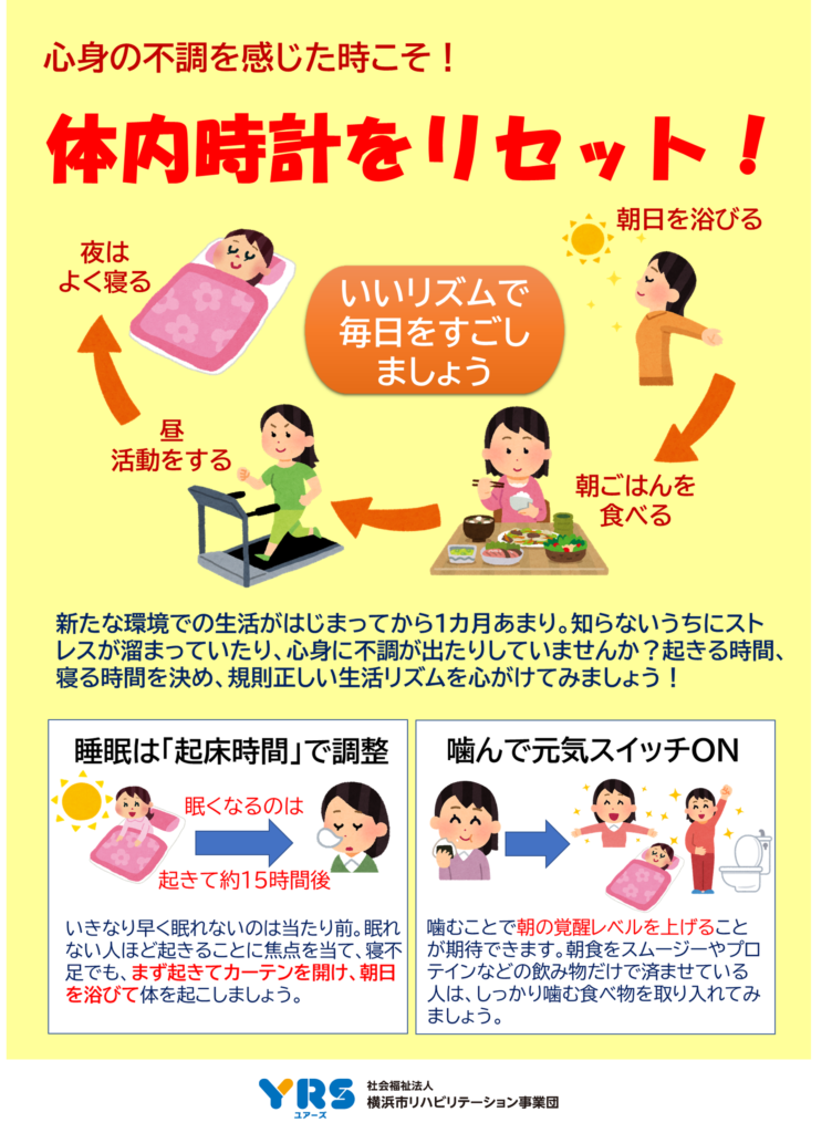 今月のポスターでは、五月病等の心身の不調を改善するポイントを紹介しています。