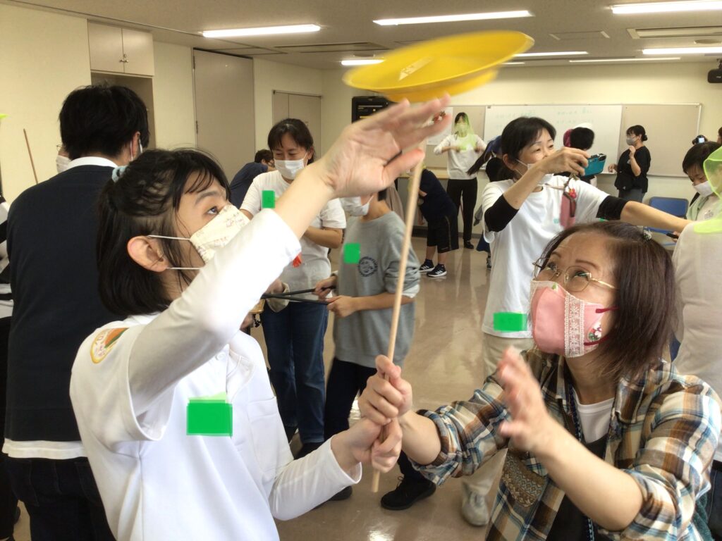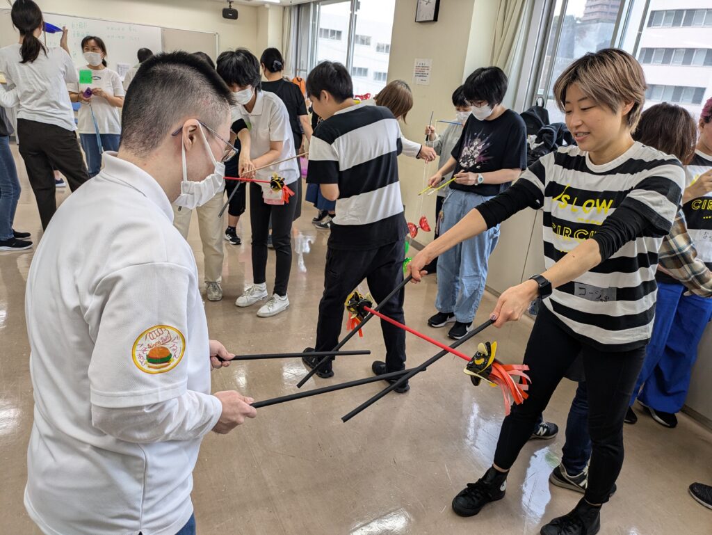 障害のある人もない人も、みんなが一緒にサーカスの技術を習得することを通じて、信頼関係を深め、協調性や自尊心、問題解決能力を育てることができるのがソーシャルサーカスです!皿回しやディアボロ(中国ゴマ)などの大道芸でよく目にする道具を使って楽しく体を動かしながらワークを進めていきます!