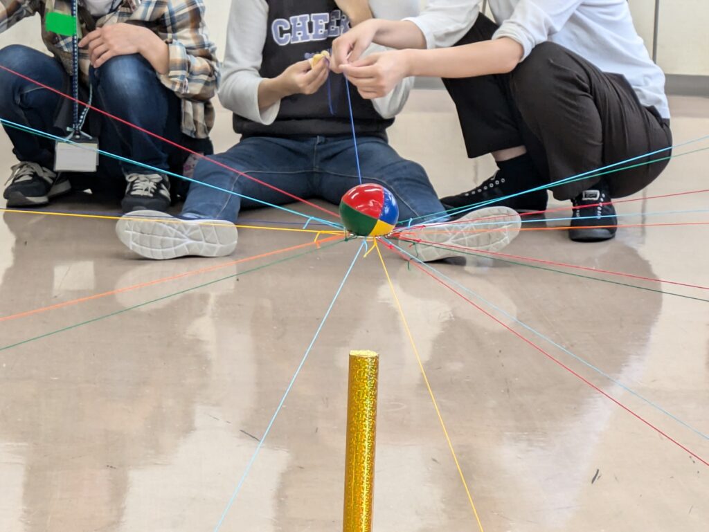 一人一人が握っている紐が繋がっている先には一つのボールが!そのボールを落とさずにゴールであるポールまでゆっくりゆっくり運んでいきます。無事ポールの上にボールを置くことができれば成功です!