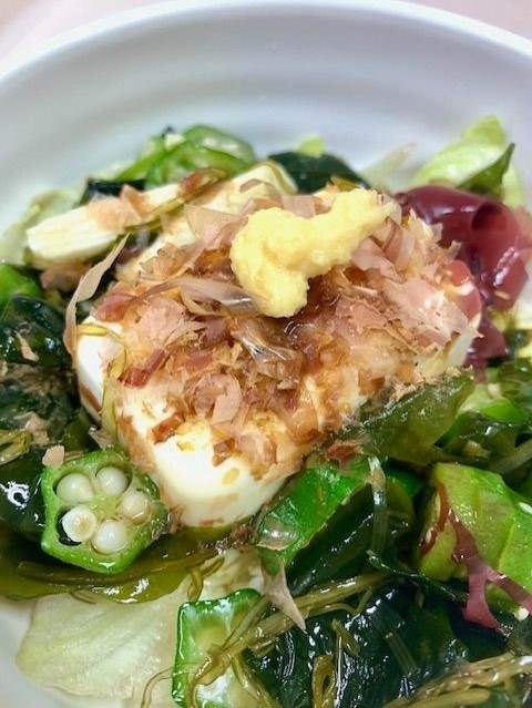 海藻サラダをのせてつるんと食べやすい、具だくさんの冷ややっこ!