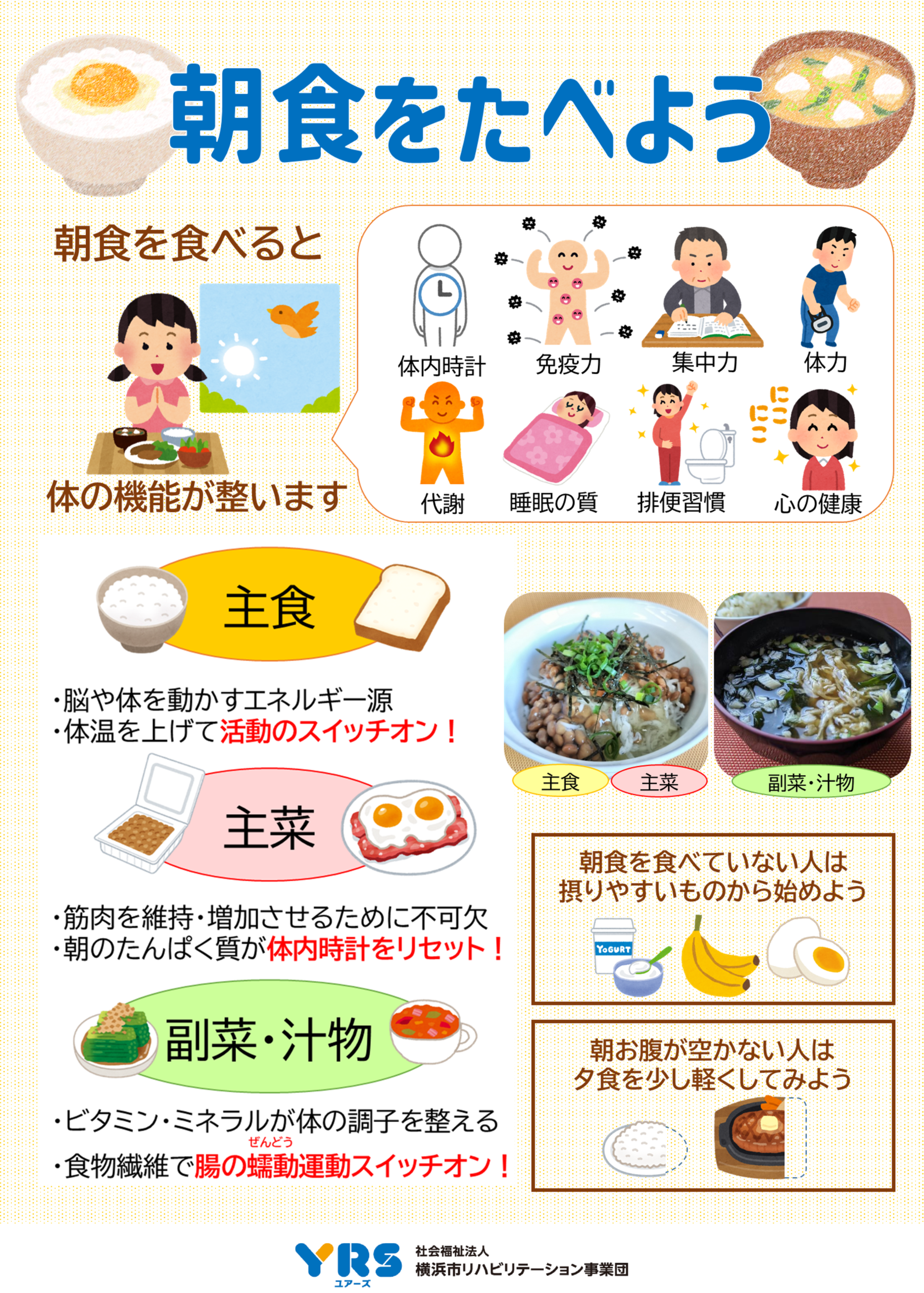 今月のポスターでは、朝食と健康の関係や、食べ方のポイントを解説しています。
