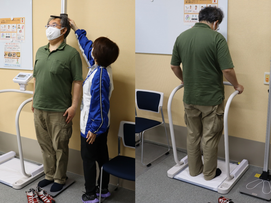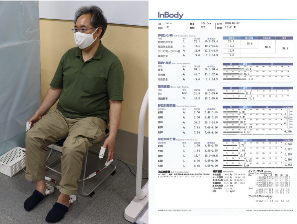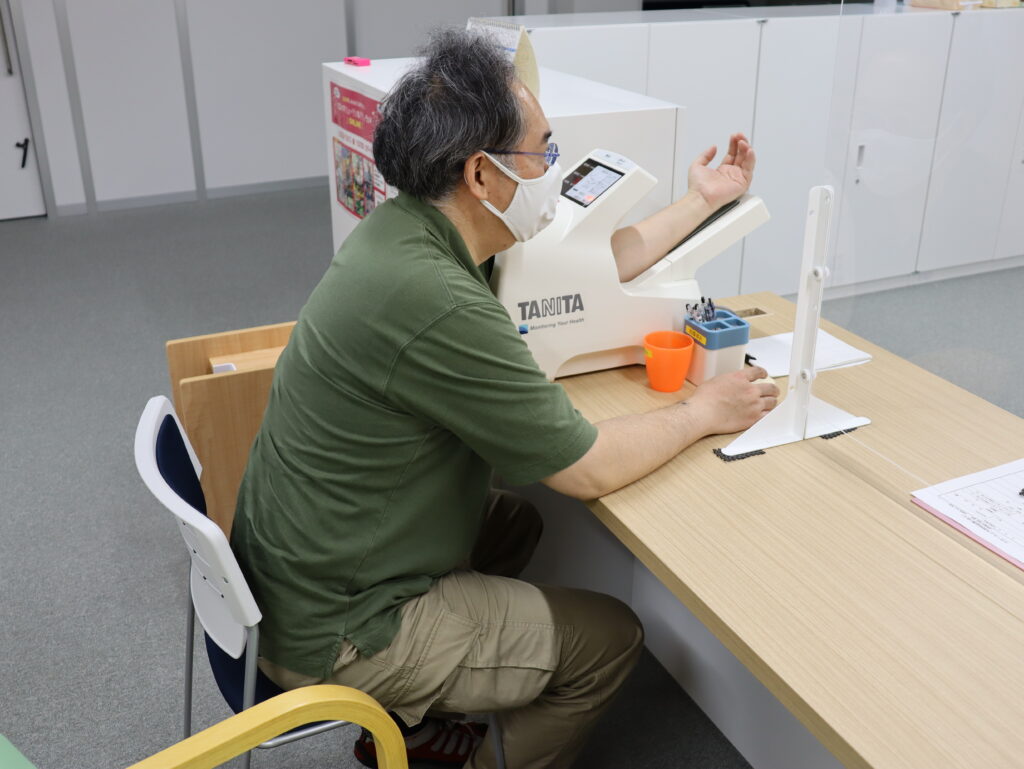 座ったまま筋肉量、体脂肪量、水分量等を測ることができ、結果がすぐに出ます