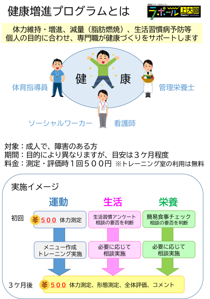 ラポール上大岡では、一人一人の健康づくりを目的とした「健康増進プログラム」を実施しています。