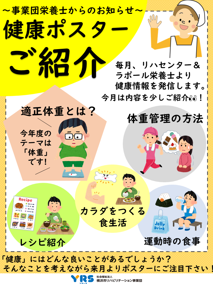 ラポールでは、栄養士が作成した健康に関するポスターを掲示しております。体重管理、運動時の水分補給や食べ方、筋肉や骨を作るための食べ方など、運動と併せて実践してほしい健康情報ですので、ぜひご覧ください!