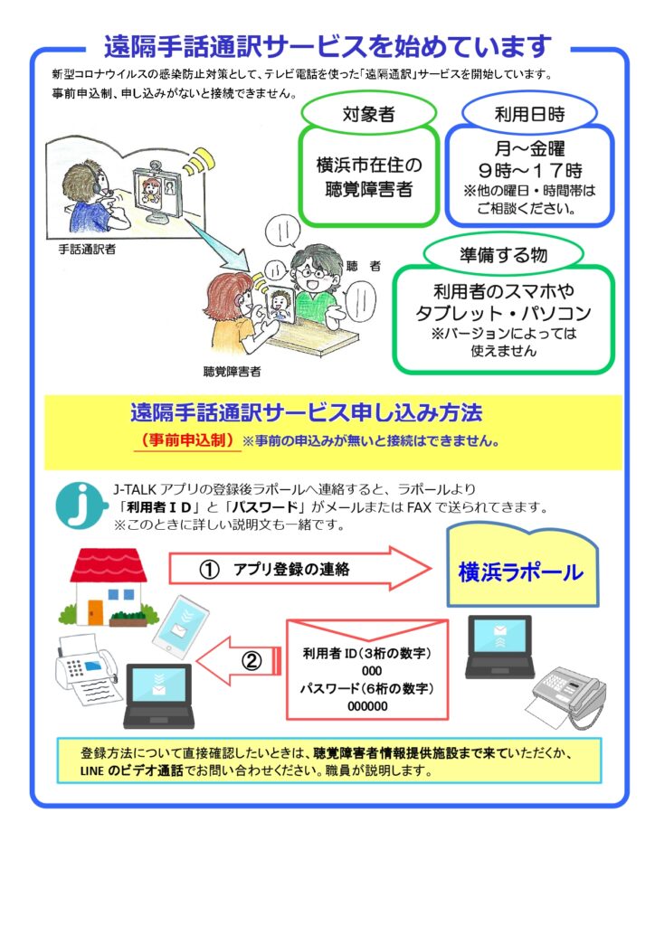 お持ちのスマホ、タブレットで手話通訳が利用できます。前もって登録・通信テストをしておきませんか。利用には事前の申し込みが必要ですが、発熱外来の受診、急なご依頼などは、J-TALKが便利です。横浜ラポール聴覚障害者情報提供施設