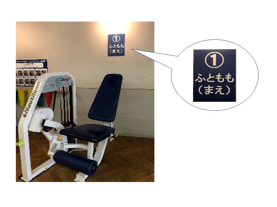 自主的に運動が行えるように、機器に番号をつけ、鍛えたい部分の表示を工夫しています。