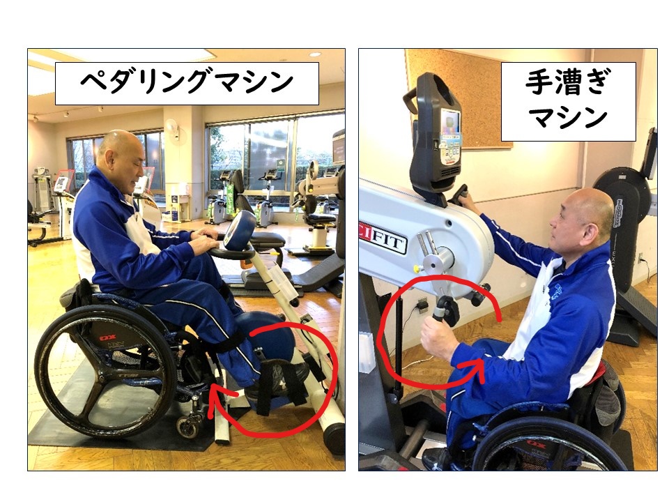 他にも、手を使ってハンドルを回し、有酸素運動が行える通称手漕ぎマシンがあります。どちらも車いすに乗ったまま使用することができますので、ぜひお試しください!
