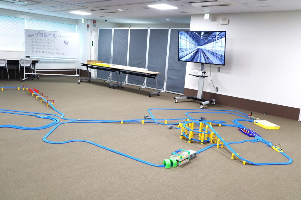 ラポール上大岡8階の多目的室の広い空間を使って、自由にプラレールを組み立てて遊ぶ「プラレールであそぼう!」。