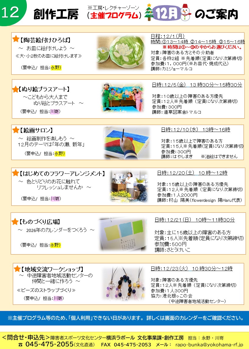 12月も創作工房では様々なイベントを開催します。創作活動を通して豊かな時間を過ごしませんか?