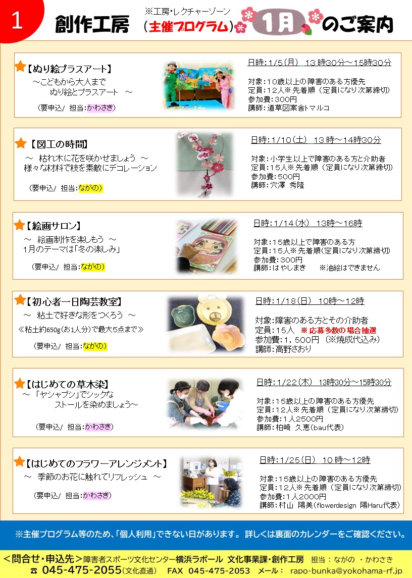 2026年のスタートです。2026年は「午年」ということで、創作工房も「力強く」「前に」進んでいきたいと思います。まだまだ寒い日が続きますが、創作工房では、1月もさまざまな主催プログラムがございます。プログラムの開催がない日は、ものづくりのフリースペースとして個々のペースで自由に創作活動に取り組むことができますので、是非、創作工房でものづくりをお楽しみください♪お待ちしております。