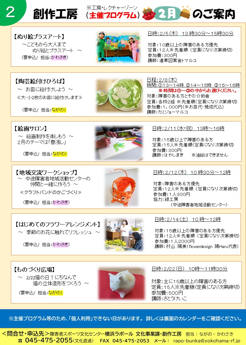 寒さがより一層厳しい季節となりました。2月も創作工房ではさまざまなイベントを開催します。イベントがない日は、工房のお部屋をフリースペースとしてご利用いただけます。絵ハガキやスタンプ・廃材工作などの「アート体験コーナー」は、無料で楽しめます。(※一部有料のものもあります)ぜひ、創作工房にお立ち寄りください♪お待ちしております。