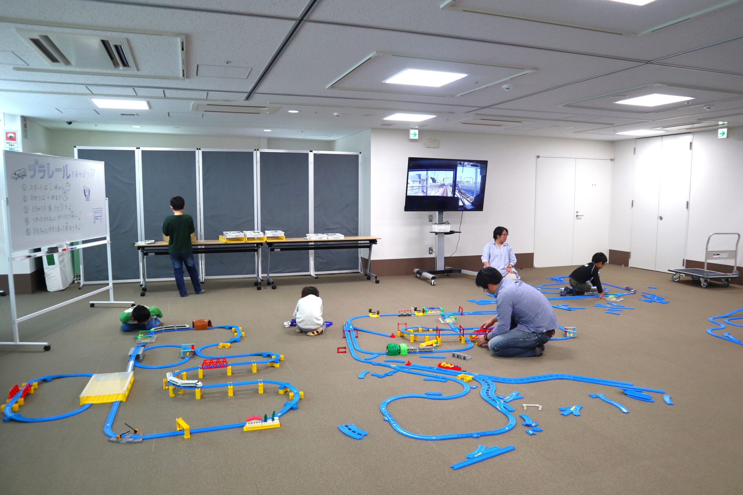ラポール上大岡8階の多目的室の広い空間を使って、自由にプラレールを組み立てて遊ぶ「プラレールであそぼう!」。