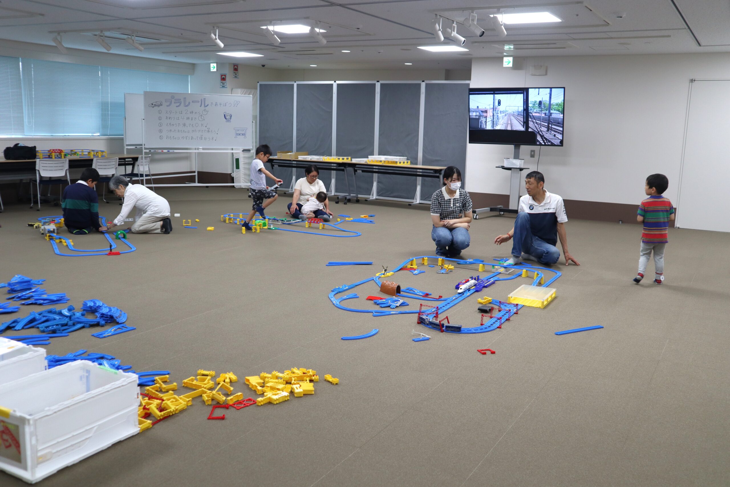 ラポール上大岡8階の多目的室の広い空間を使って、自由にプラレールを組み立てて遊ぶ「プラレールであそぼう!」