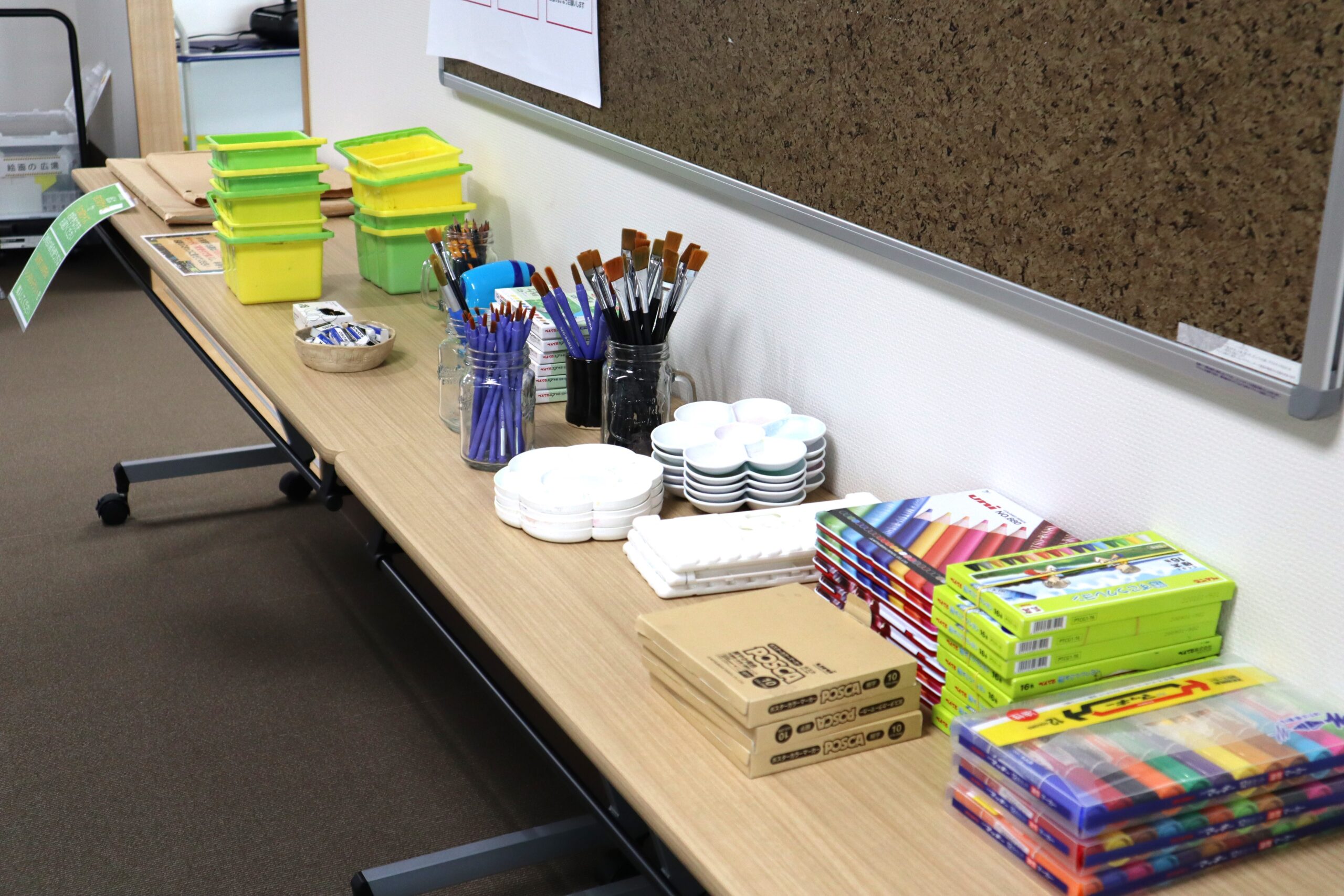 画材道具(画用紙、水彩絵の具、筆、パレット、筆洗器、色鉛筆、クレヨン、油性ペンなど)はレンタル出来るので、手ぶらでの参加も可能です。