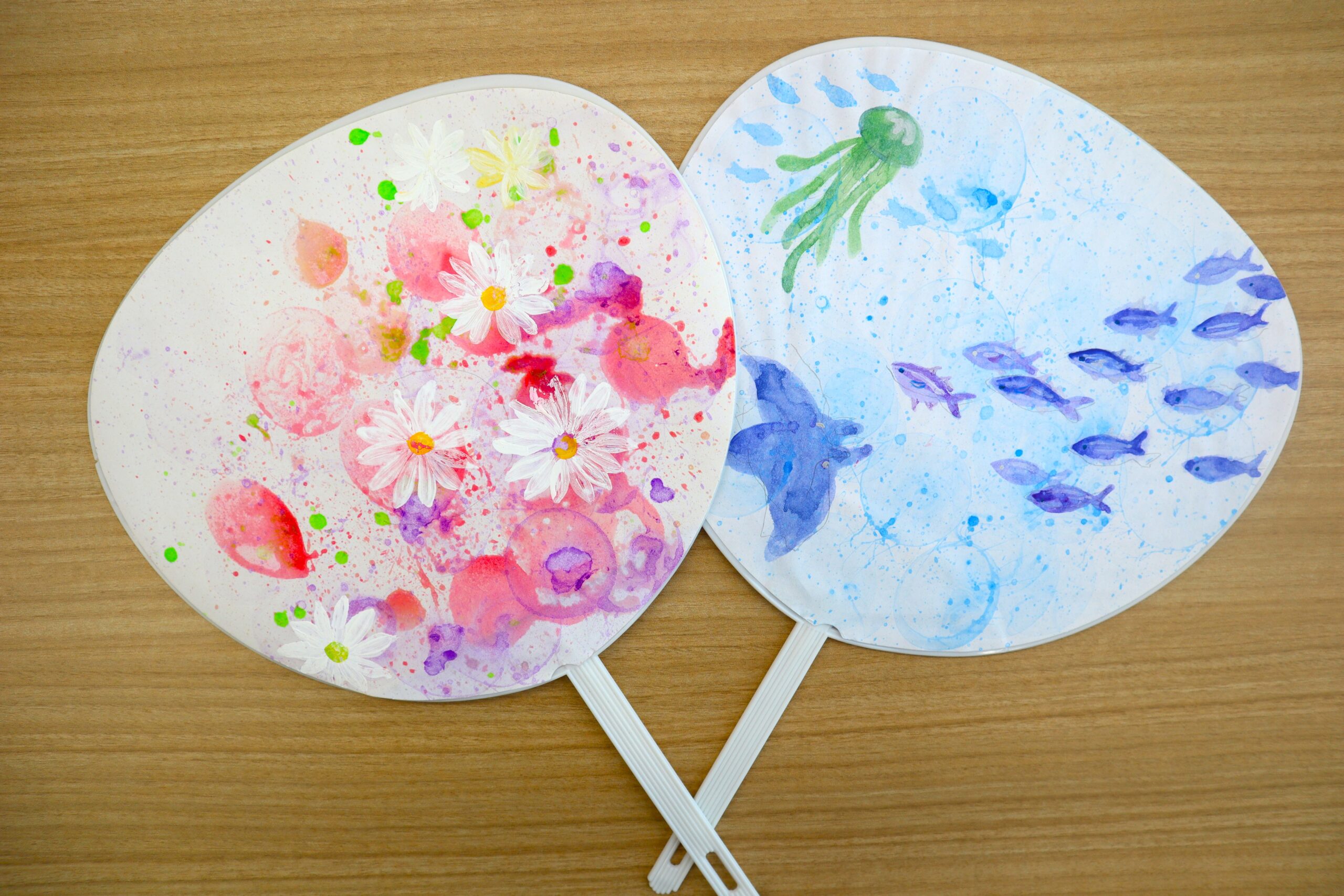 シャボン玉をふきかけて生まれる模様と、好きな絵を組み合わせて、世界にひとつのオリジナルうちわを作ります♪