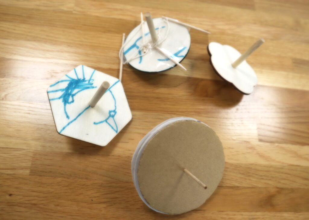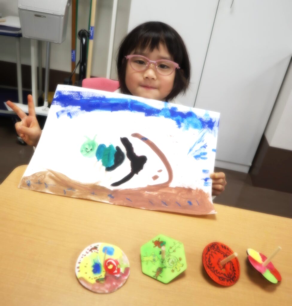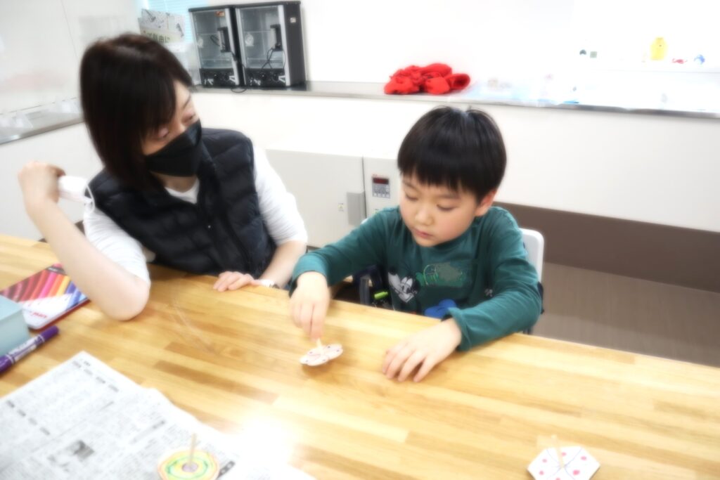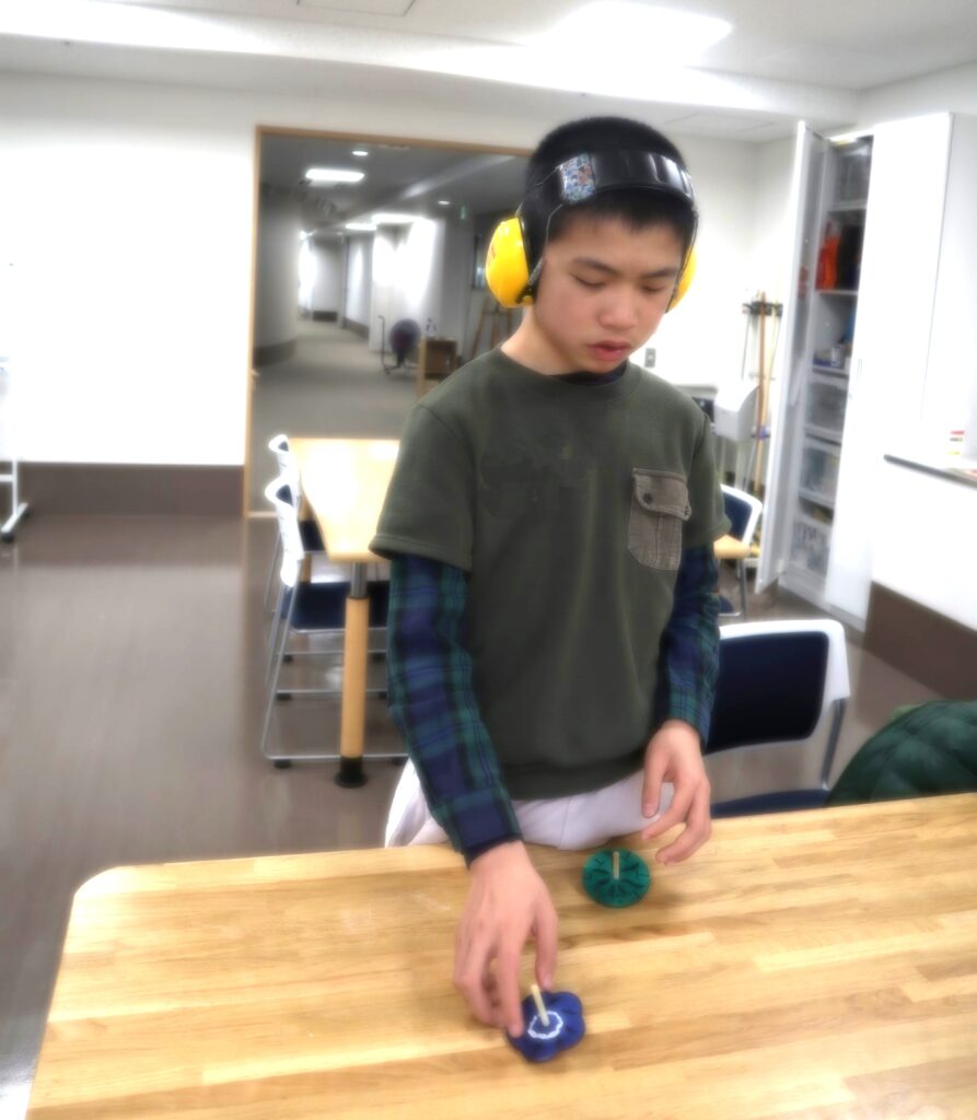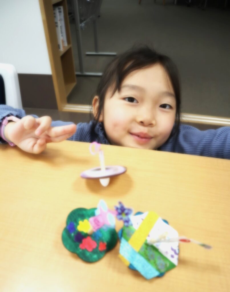 早々に作り上げて、コマ回し大会が始まりました♪