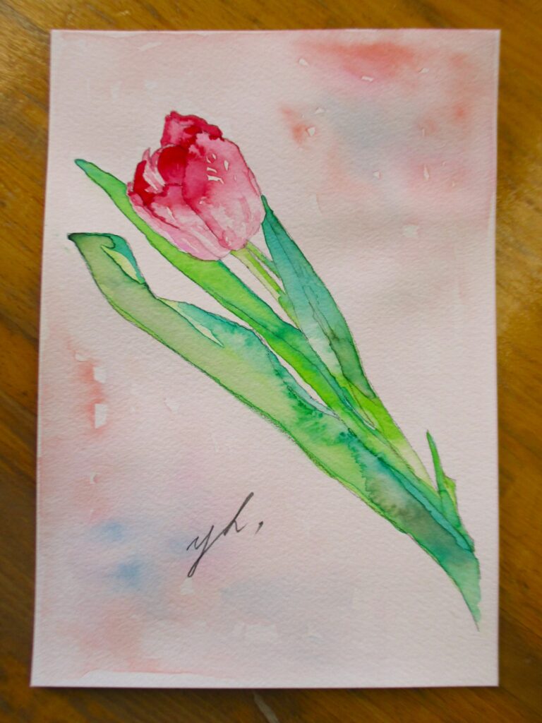 一輪のチューリップ。優しい色合いの絵ですね。
