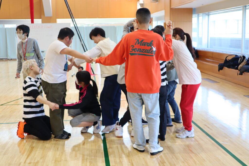 まずは、体をほぐすために「人間知恵の輪」からスタート