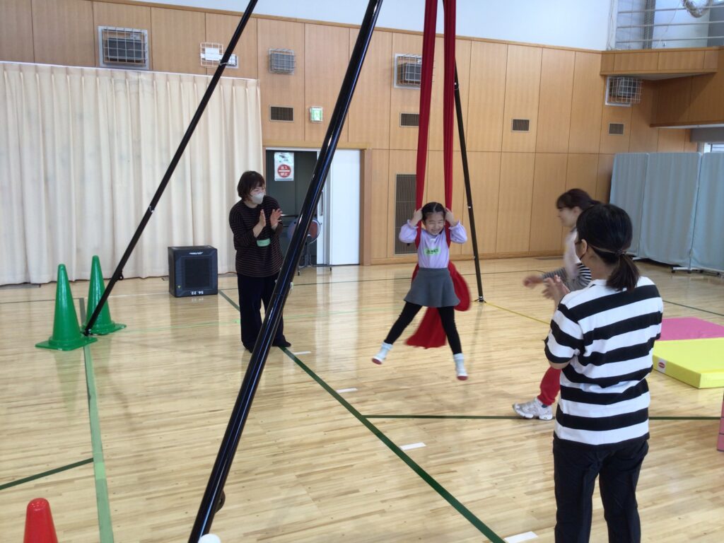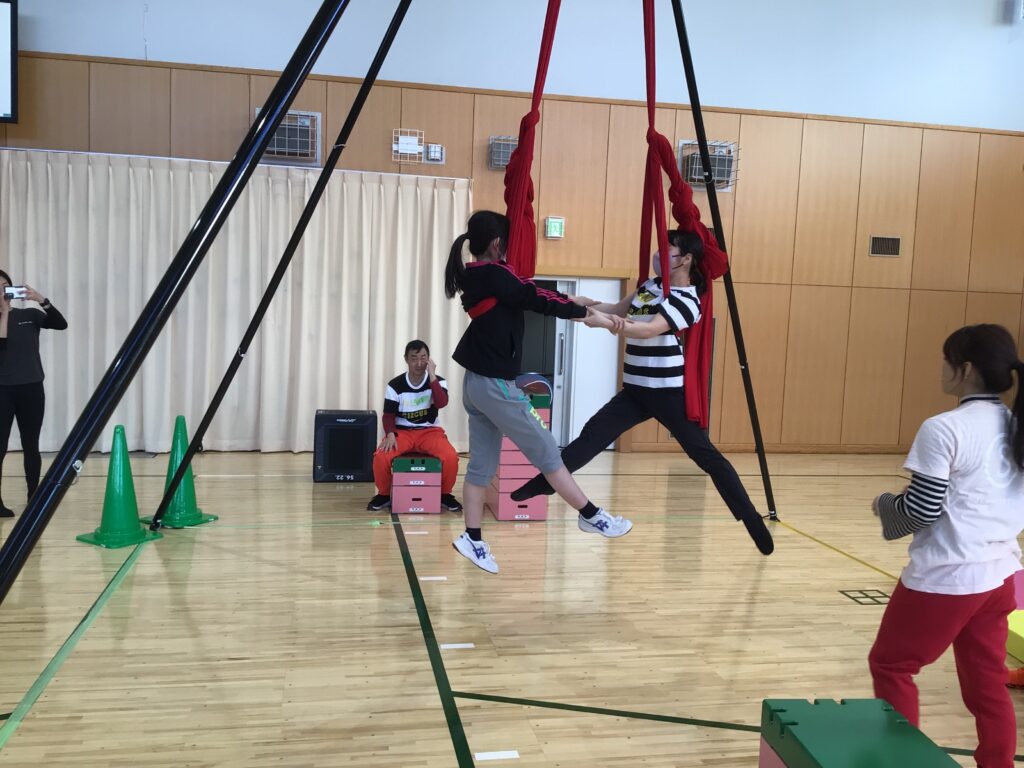 今回は「エアリエル」を体験してのワークショップでした。「エアリエル」とは空中演技の演目の一つで専用の機器を使用する必要があります。