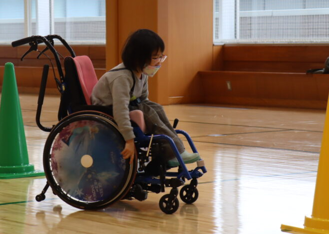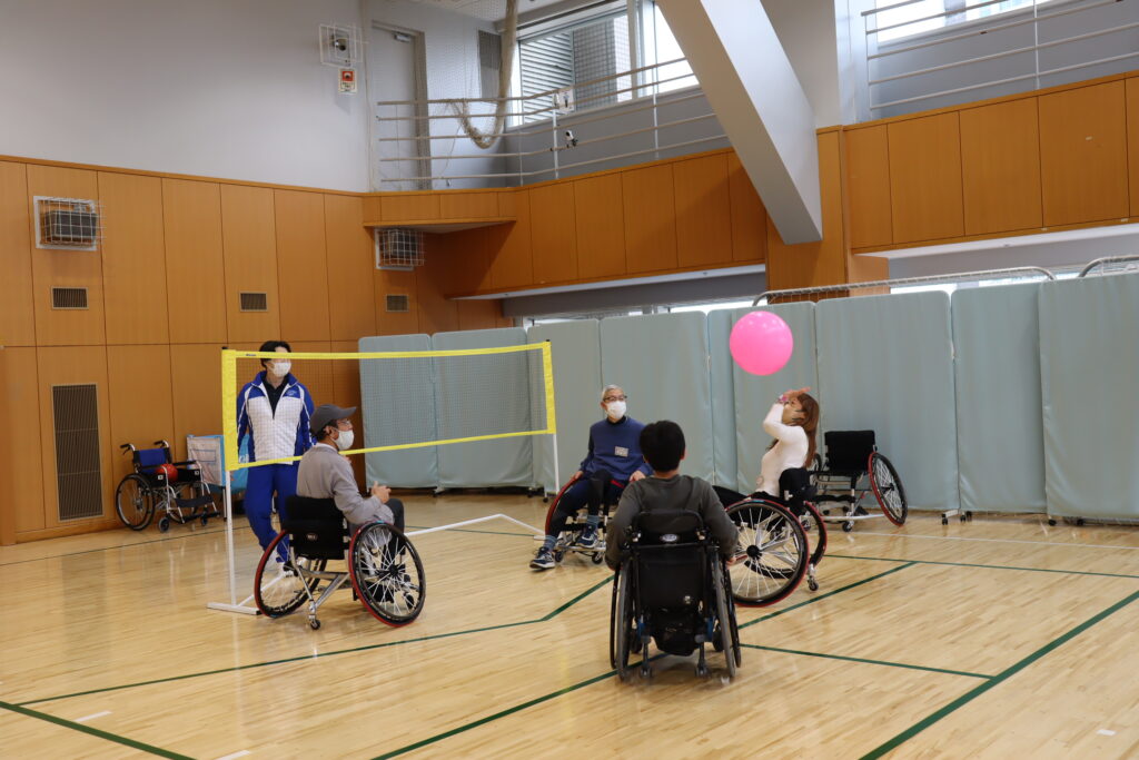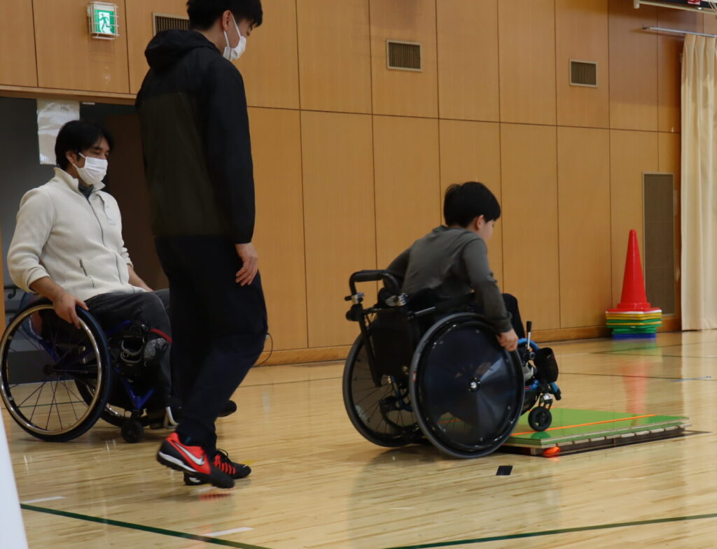 基礎練習の後は、スポーツ指導員と車いすスポーツの経験もしてみました。