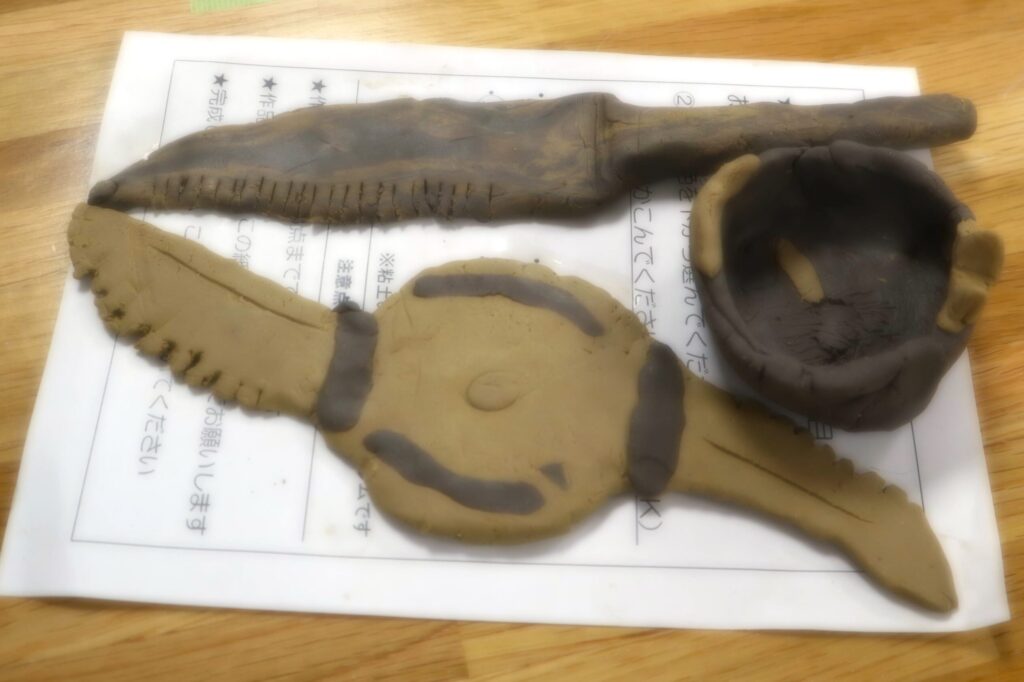 古墳から出土した!?と思わせる道具の数々をオーブン陶芸で作りました。ナイフの刃のぎざぎざなどすごいですよね。