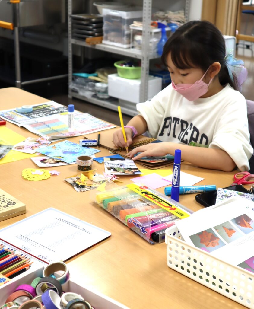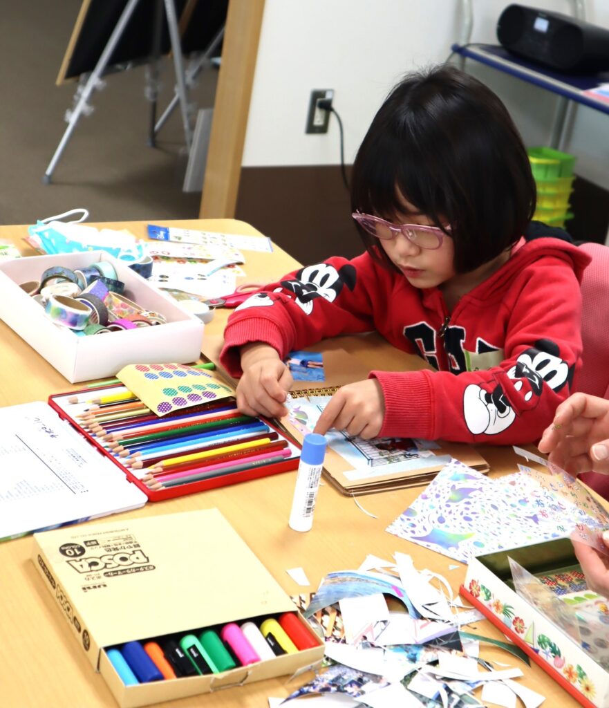 スクラッブブックに絵を描いたり、シールを貼ったりして飾りつけながら、ご持参頂いた参加者各々の想い出の写真を貼って、自分だけのオリジナルのアルバムを作成しました。
