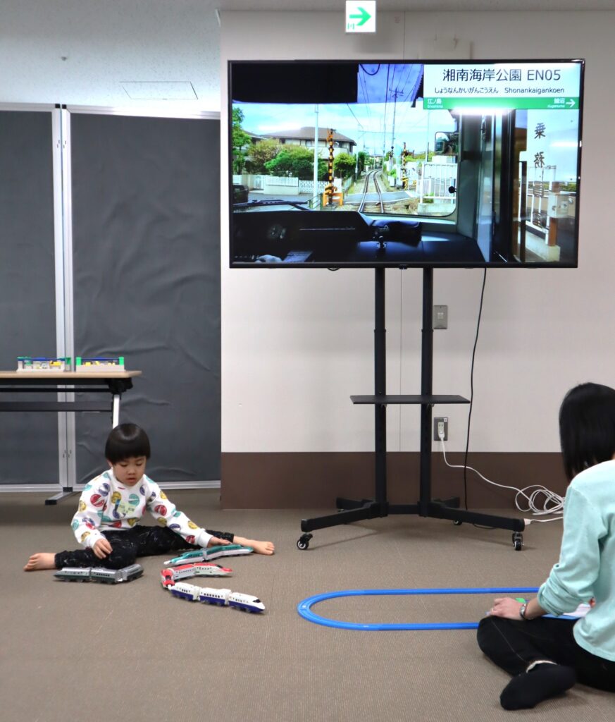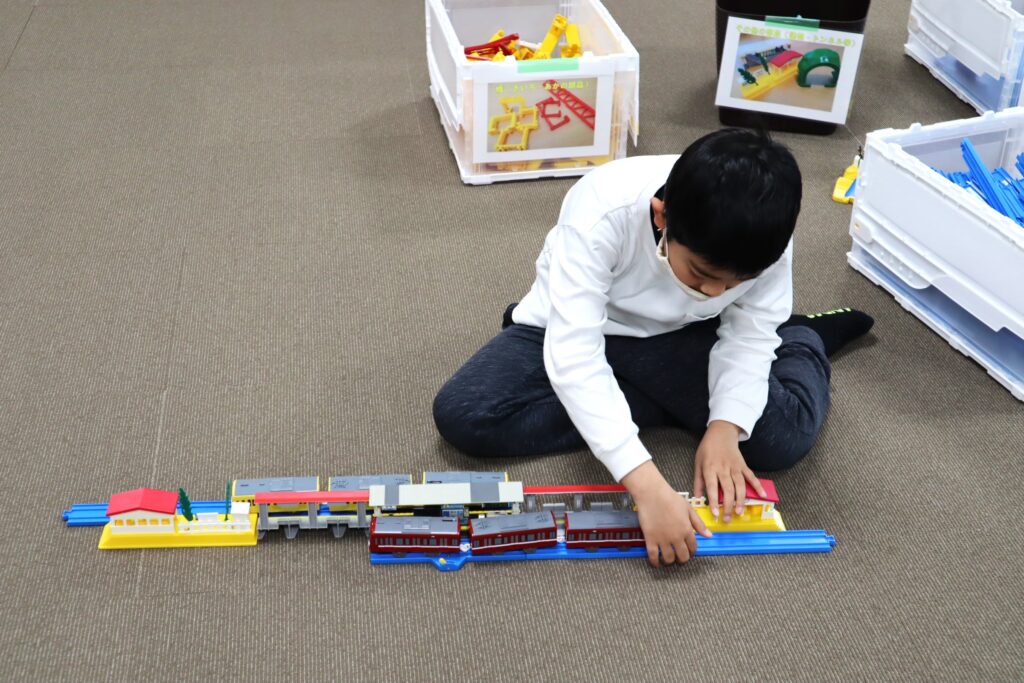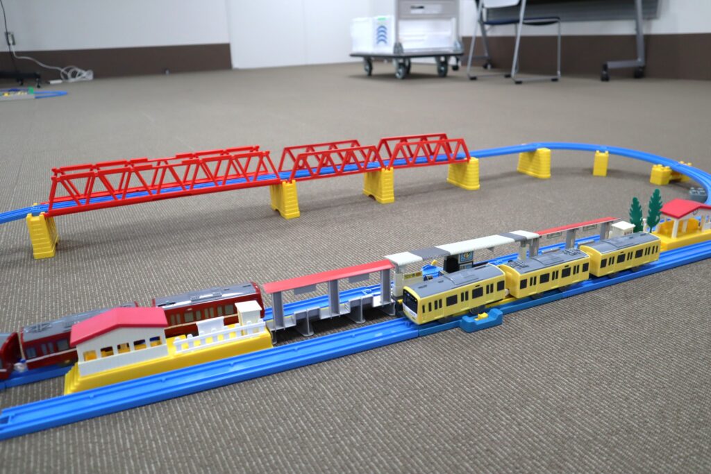 ラポール上大岡8階・多目的室の広い空間を使って、自由にプラレールを組み立てて、2時間思いっきり遊ぶことが出来る「プラレールであそぼう!」