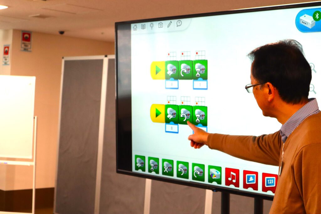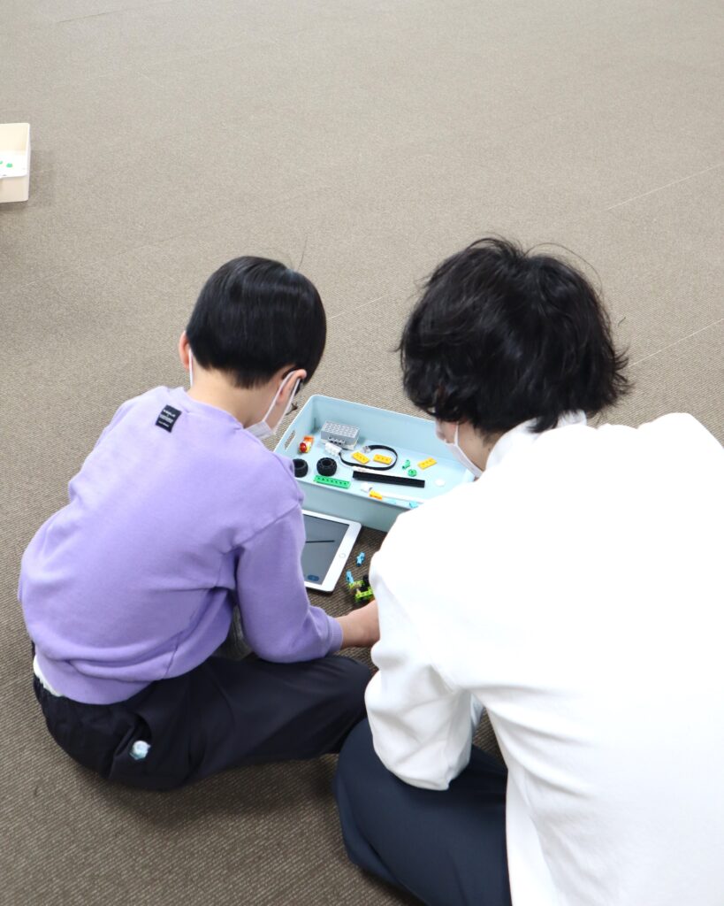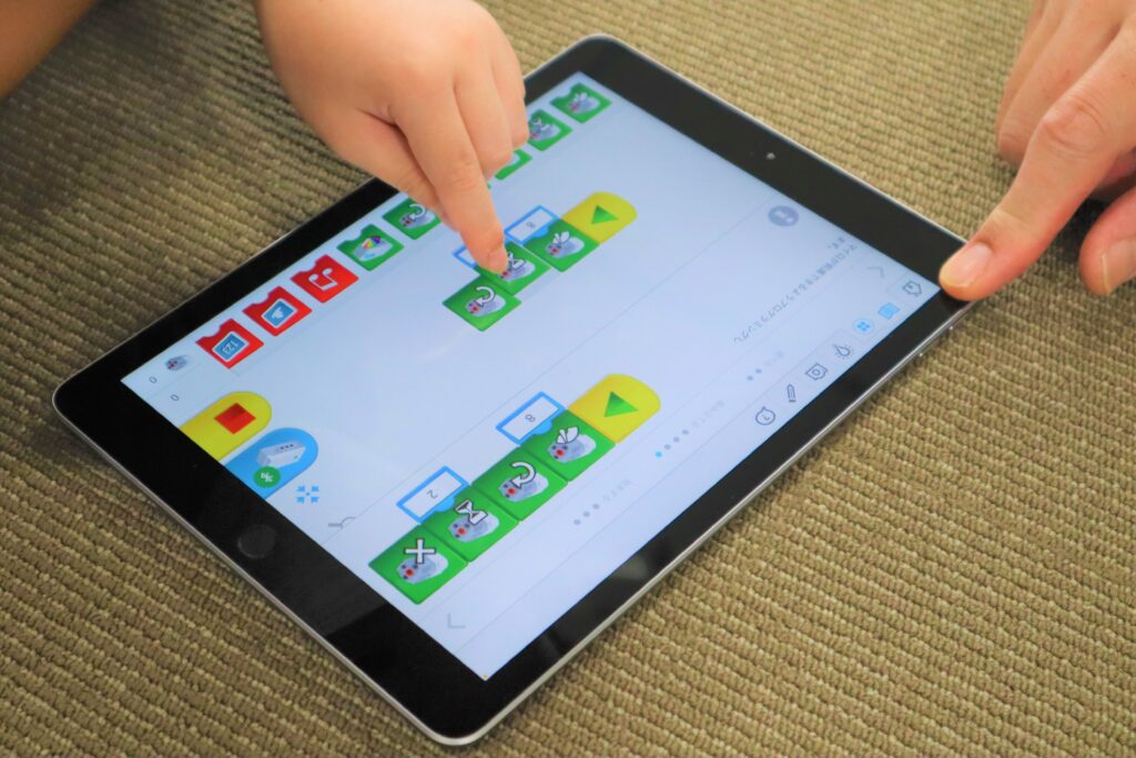 そして、2回目の3/3は、参加者より「カエルを作りたい!」とのリクエストがあり、実際にレゴブロックでカエルを作りました。さあ、ここからが本番。タブレットを使って、イルカやカエルの動きを「プログラム」。自分の思い通りに動かして遊びます。
