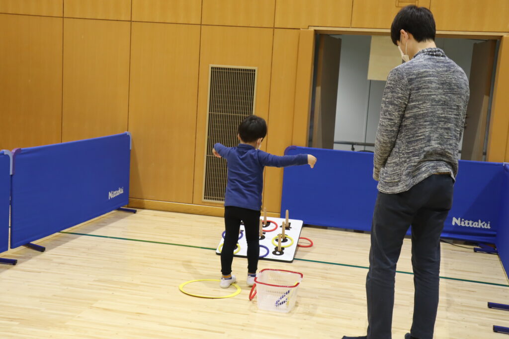 この日、人気だった遊びはトランポリンとサーキット、そして輪投げでした。輪を投げる動きは、ボールを投げる動きとは少し違って子どもたちもはじめは難しい表情を浮かべていましたが、コーチやお父さんから投げ方を教わるとたちまち上手になっていきました☺