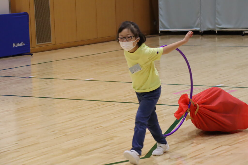 また、今回は体育室内のランダムにJPクッション(写真の赤と青の四角いクッションです)を置き、フォーメーション移動を取り入れました。一斉に移動したにもかかわらず子どもたちは上手にお互いをよけながらJPクッションまで移動していました。周りを見ながら、よけながら移動するって案外難しくてぶつかる子も多いのですが、4人とも上手にできていました( *´艸`)