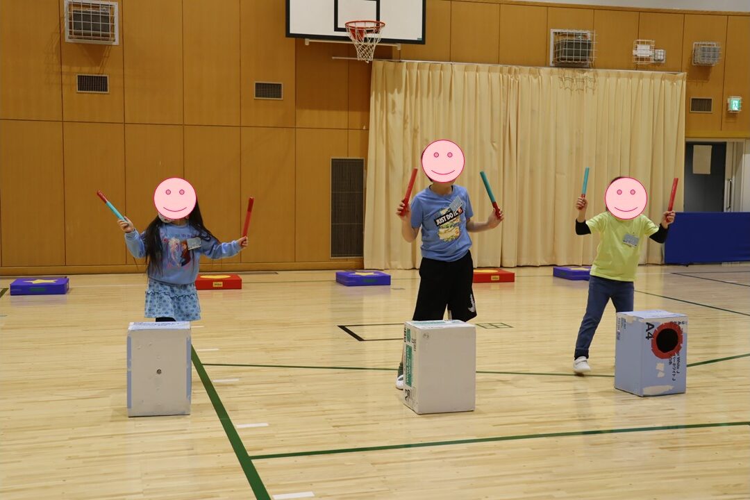 どちらも新聞棒やスカーフを使ってダンスしました。用具を使うことによって動きを大きくできたり、音を出したりすることで子どもたちの意欲を引き出すことができます✨