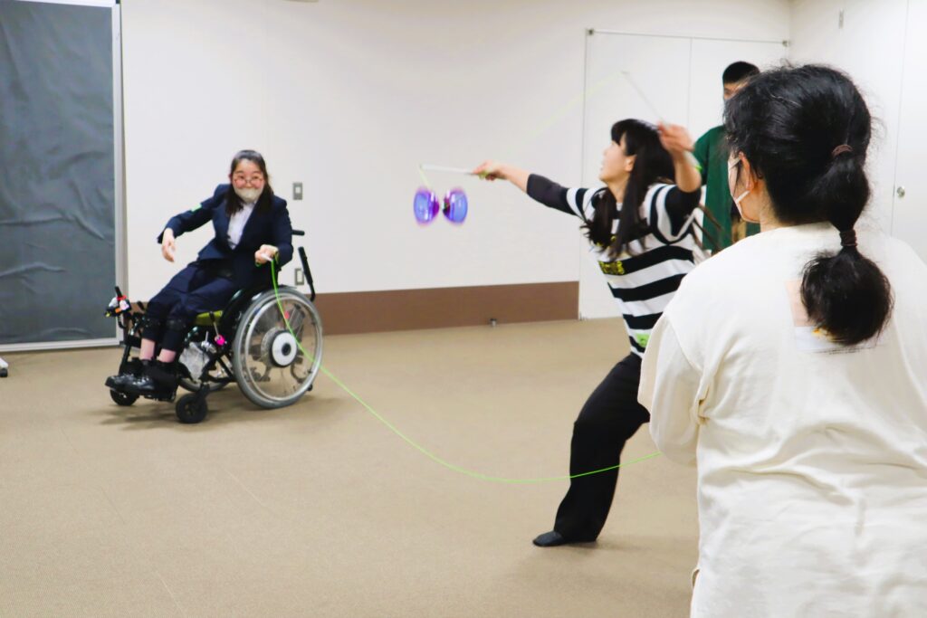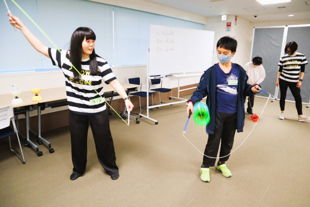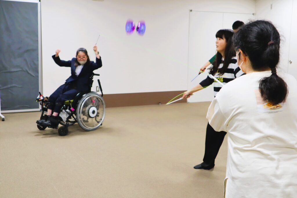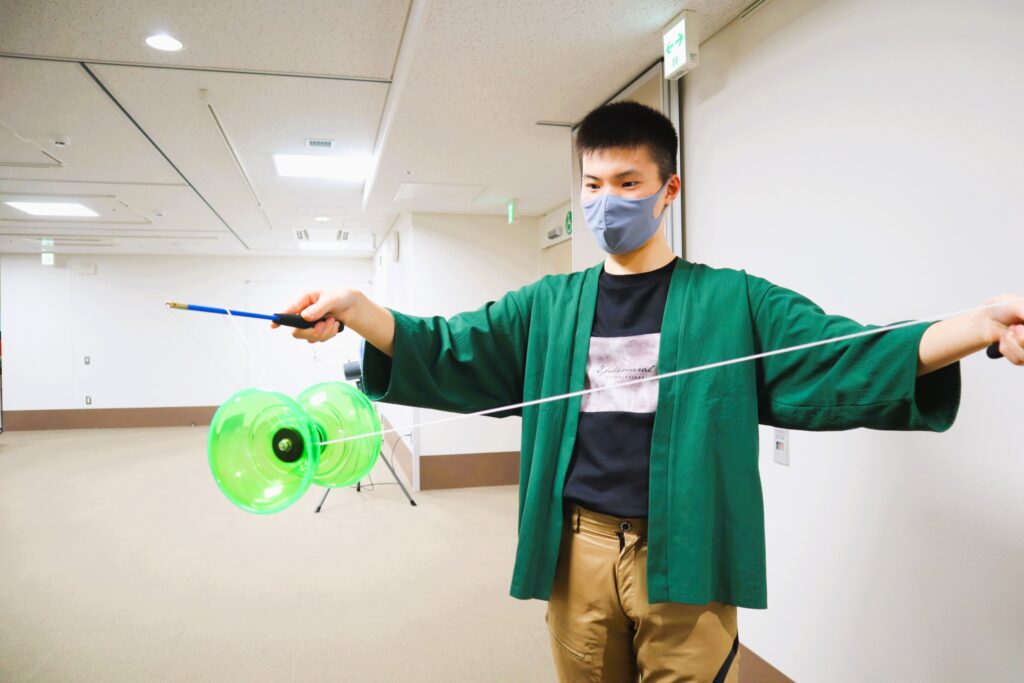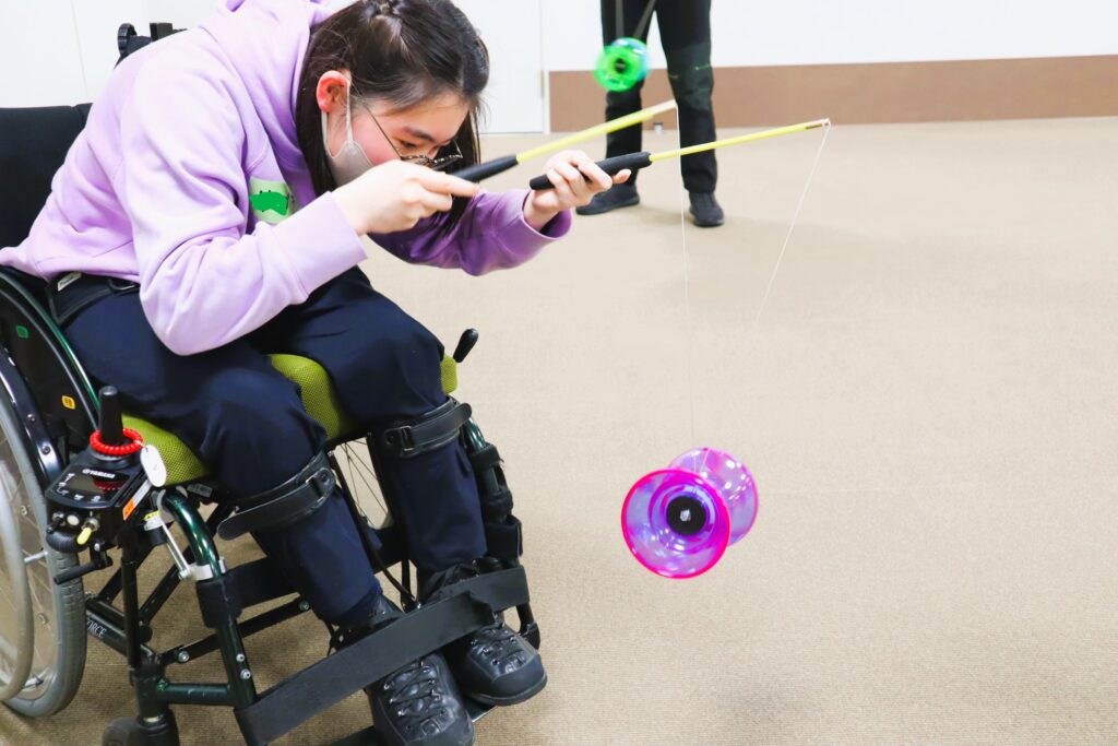 色鮮やかなコマを転がし、2本のスティックを操りながら、さまざまな技を練習しました。