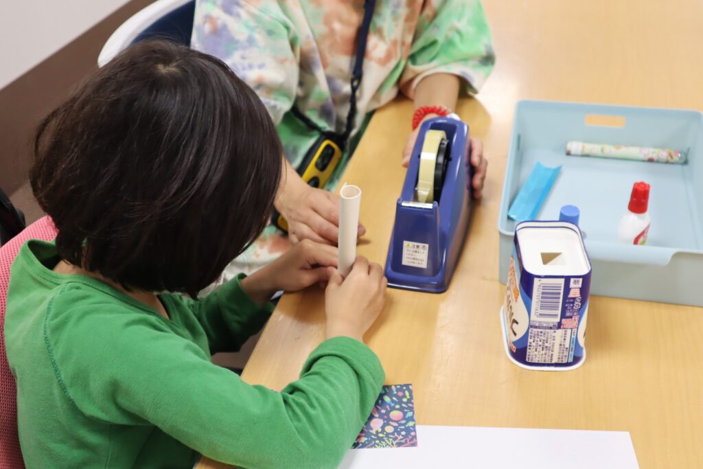 万華鏡の筒の柄は何十種類もある折り紙の中から自分の好きなものを選び、筒になる厚紙に貼り付けていきます。