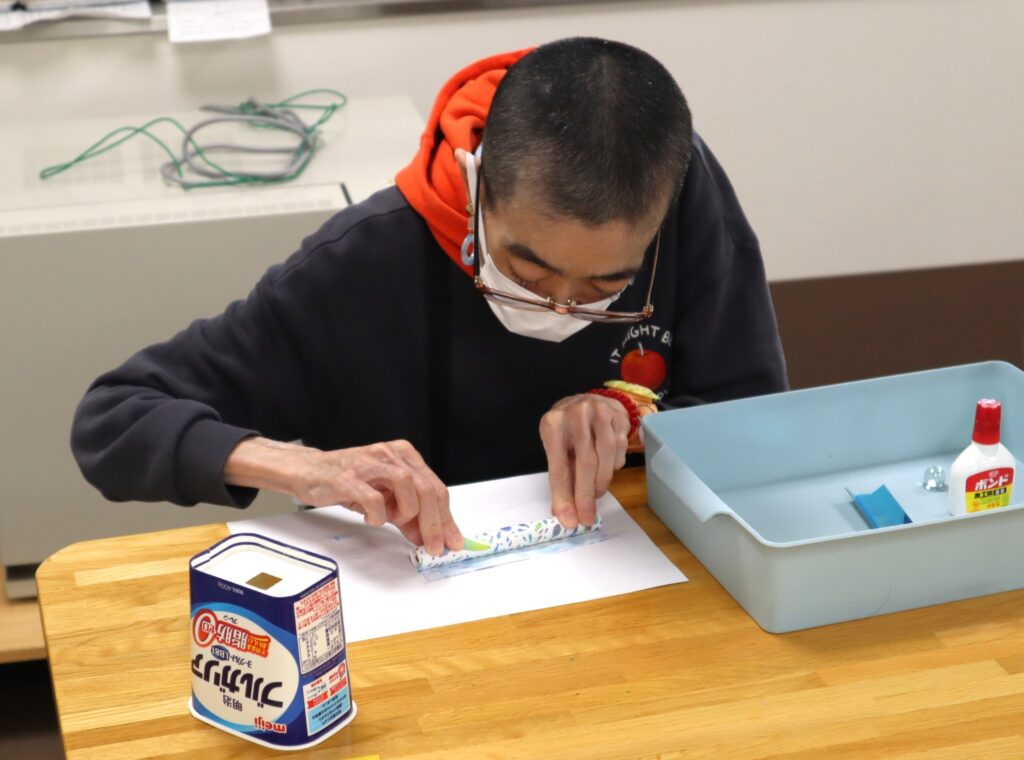 まず講師の先生に分かりやすく作り方を説明してもらい、スティックのりやボンドを使って、万華鏡を組み立てていきます。