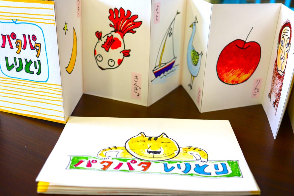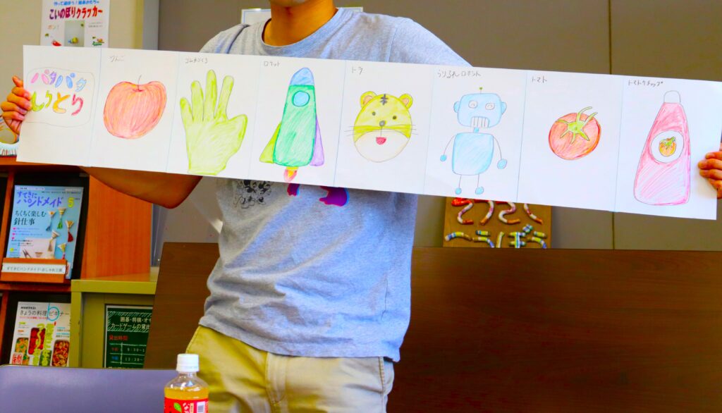 こちらのパタパタしりとりは、「りんご」⇒「ゴム手袋」⇒「ロケット」⇒「トラ」⇒「らりるれロボット」⇒「トマト」⇒「トマトケチャップ」でつなげました。自由な発想で、とてもユニークで素敵な作品に仕上がりました!