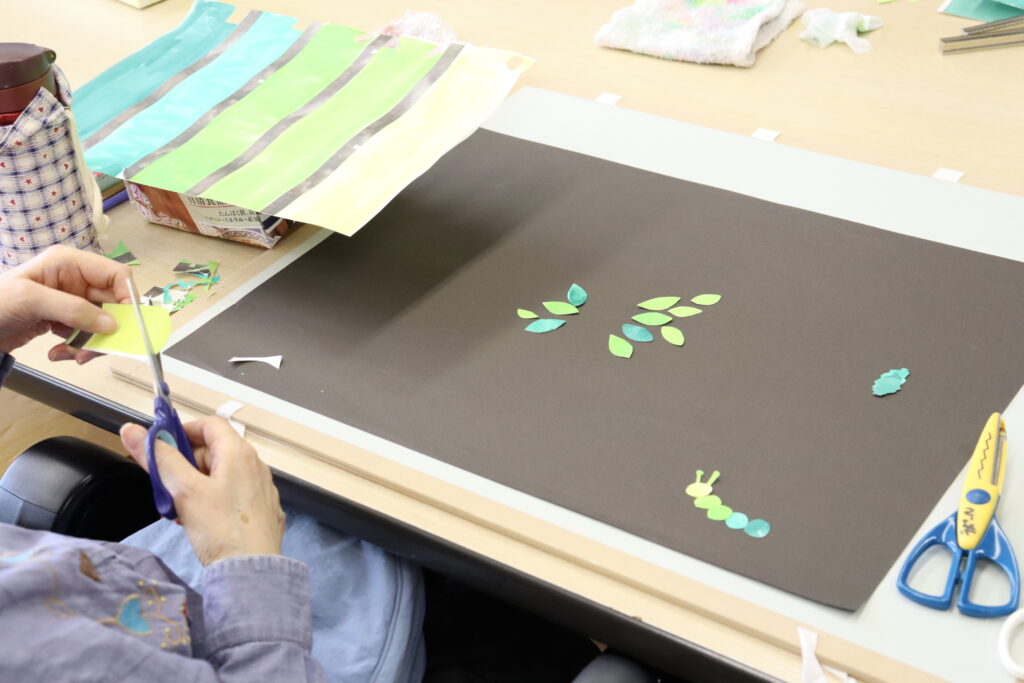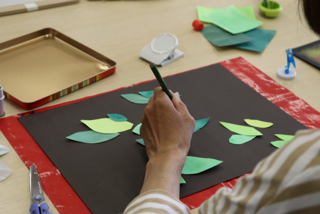 作った緑色のグラデーションの画用紙を切ったり貼ったりしながら、「コラージュ」の技法を使って、自分のイメージする「新緑」を表現します。
