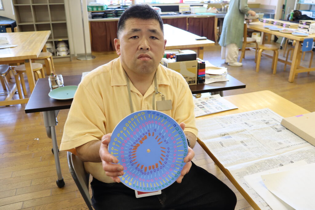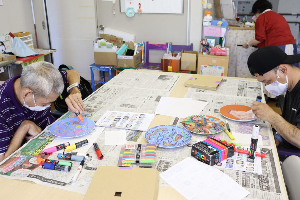 「図工の時間」は小学生以上の障害のある方を対象に、横浜ラポール2階にある「創作工房」で実施しています。季節感のあるテーマでこどもから大人まで、楽しく造形活動ができます。5月は、お皿の絵付け(飾り皿づくり)を行いました。