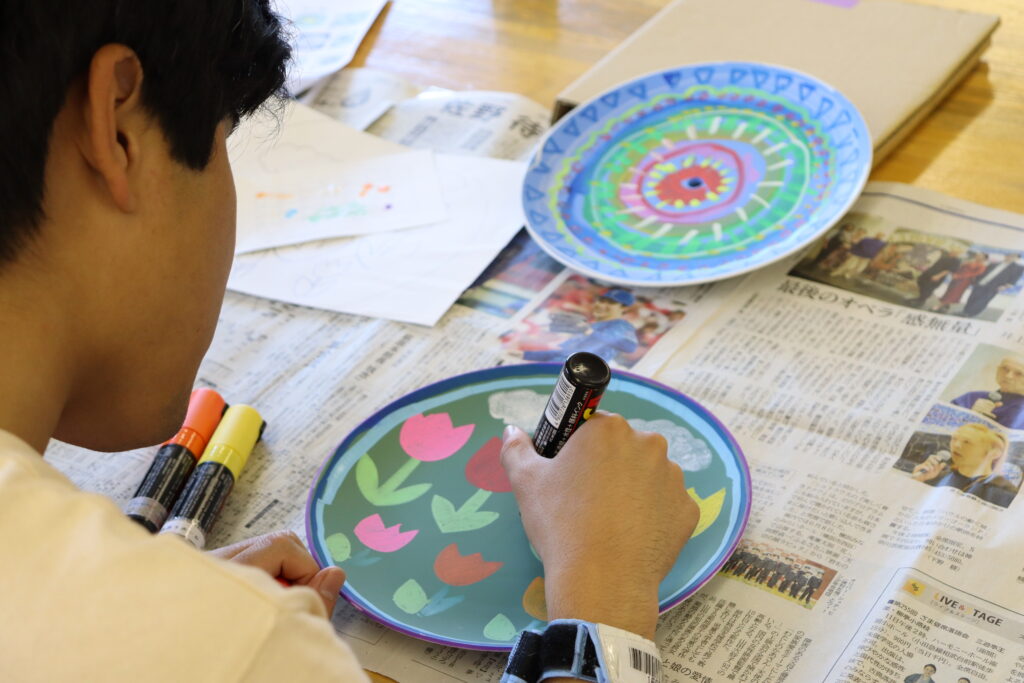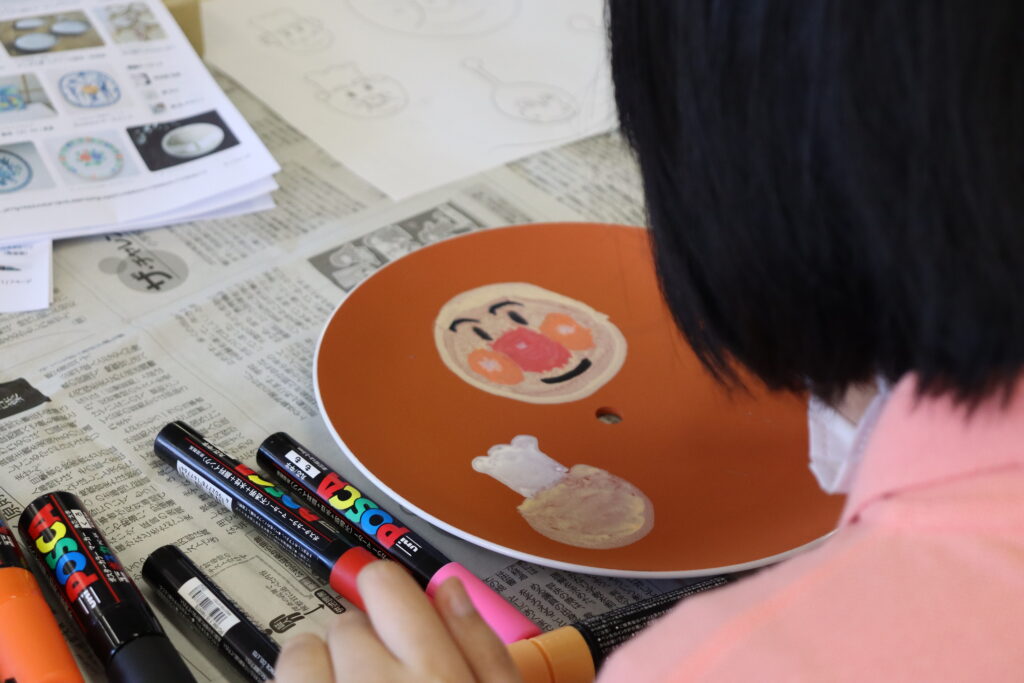 お皿は30cmほどの大きさで、「茶色」「水色」「緑色」の中から自分の好きな色を選びます。お皿はマットな質感になっているので、油性ペンやポスカ(マーカー)で描くことができるんです。今回、参加された方は、あらかじめ自分の描きたいものを紙に書いて、参加される方もいらっしゃいました。