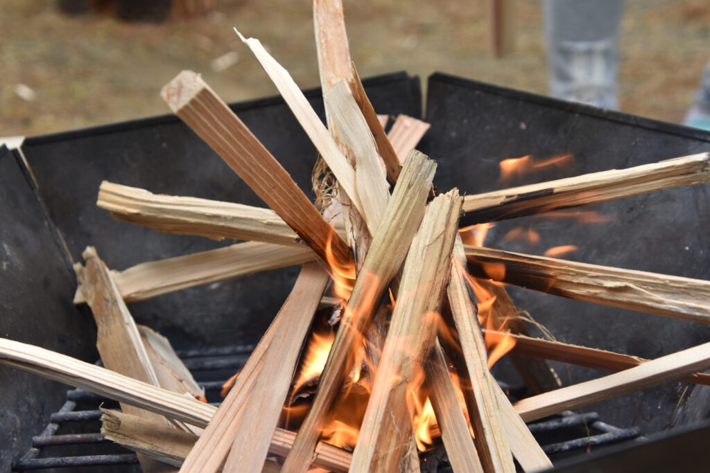 たき火dayの活動のメインは薪割りと火おこし、そして料理ですが普段なかなか経験できないことであり用具の使い方を間違えるとケガにもつながってしまうため、くろがねスタッフによるミニ講習を聞いてから活動をしました。