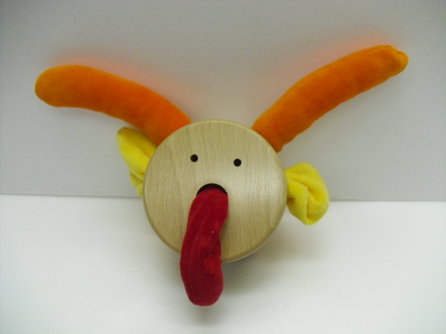 オッティというまん丸のお顔の形をした木のおもちゃは、外側や中央のあたりに布でできた長い袋状のパーツが通してあり、引っ張ると伸びるつくりになっています。ただ置いてあるだけでは、遊び方もかわいさも伝わりにくいおもちゃなのですが…まずは、真ん中の赤い布をすべて引っ込めておいて(引き抜けない構造になっています)、まずは大人が少しずつ、少しずつ引き出していくと…あっという間に興味を惹かれて「やりたい!」とすぐに手を伸ばしました。コツは、ちょっとずつ動かして見せることと、言葉で説明しすぎないこと。お子さんは「動く不思議」に注目すると、「あれ…こっちも出てくるのかな?」とおもちゃ全体にも興味を持って、最後は自分で全部の布を引っ張り出してみていました。保護者の方は、「これは、お店で見ただけでは手に取ろうと思わないかも…!」と感動してくださいました。