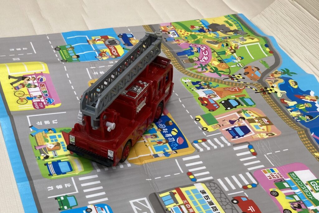 「音が鳴るはしご消防車」(今日は音を消してありましたが…)、動物が乗ったかわいい木製の車おもちゃ「レーサー」、円柱や玉のマグネットをつなげて遊べる「ジャンボマグネット」、きれいな色水が動いて模様になる不思議な板「リキッドフロア」などが人気でした。