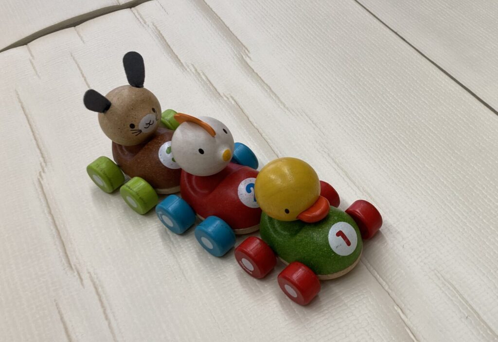 今日の遊びの実践は、例えば、紐を引っ張って歩かせるプルトイ(引っ張るおもちゃ)「ダンシングアリゲーター」は、そのまま置いてあると見向きもされませんでした。しかし、スタッフがお子さんたちの周りをさりげなく引いて練り歩くと…「カタカタカタカタ…」という音に惹かれ、急に注目を浴びます。この時、「見て見て!」と注目を促すことなく、ごく自然にお子さんが気付くように近くを「繰り返し」通り過ぎて見せるのがポイントです。電車や消防車に夢中だったお子さんが、「あれ?これにもタイヤがついてるぞ…?」と黄色いタイヤ(ワニの足)を指さして「ぶっぶ(車)」と発信したのがすごく印象的でした。乗り物と「同じ」で「好きな部分」を見つけられた瞬間です。