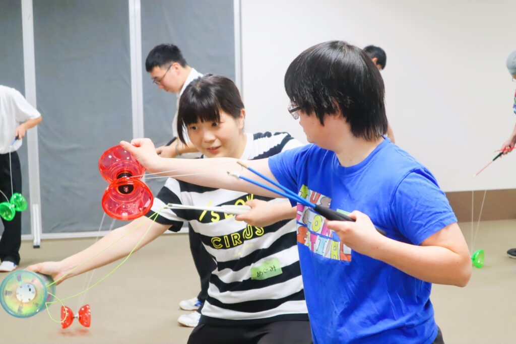 めぐみさんによる明るい指導のもと、それぞれのペースで取り組みました。ディアボロをはじめてさわる方でも、最初はむずかしく感じても、あっという間にコツをつかんでいました。