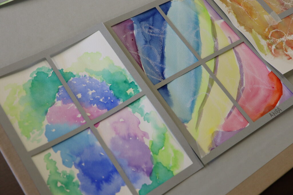 まず、絵の具を混ぜて自分の好きな色を「7色」つくるところからスタート。7色、色をつくったら、画用紙に色を塗ったり・水を多めに含ませて、画用紙に色を滲ませたりしながら、それぞれ思い思いに「わたしの虹色」を作成します。